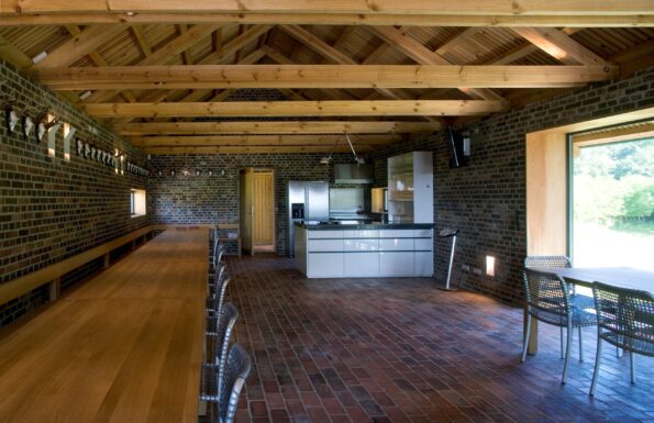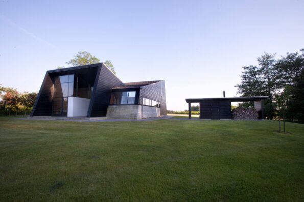 Moderne lagerbygning med fasaneri, opført i spåndækket sorttjæret pommersk fyr.